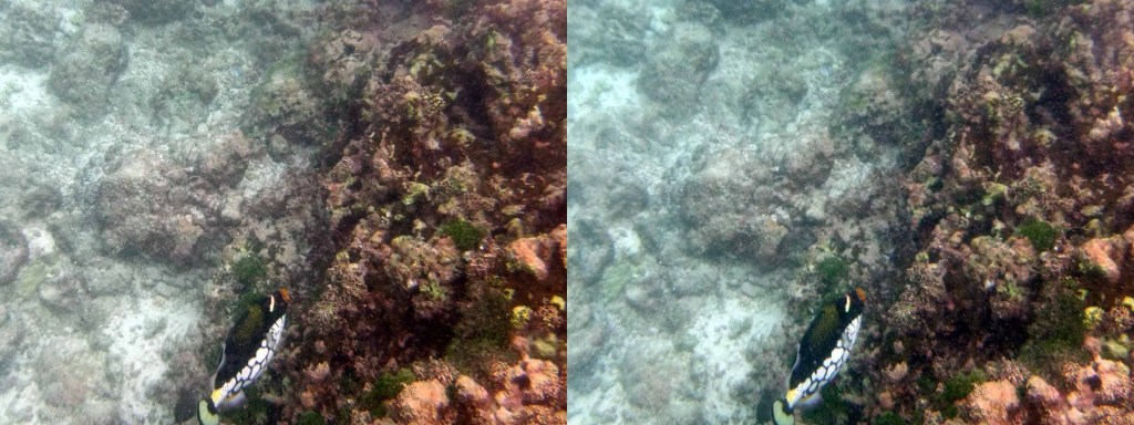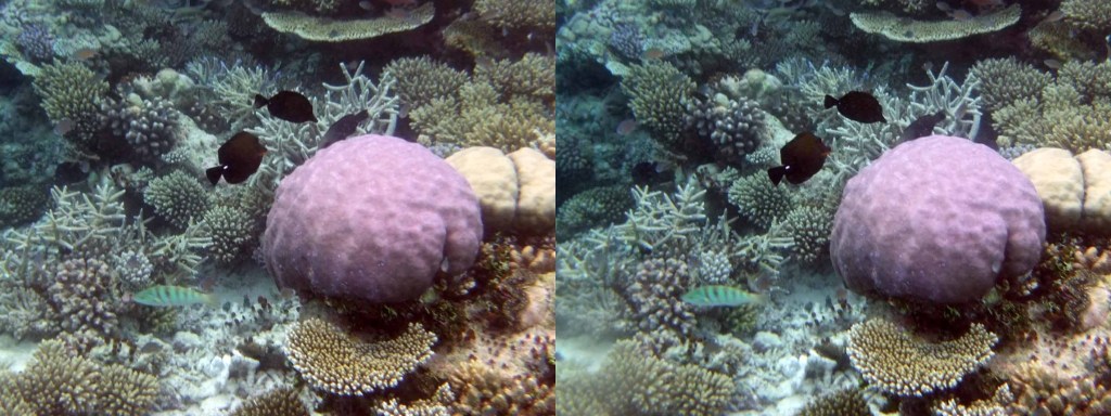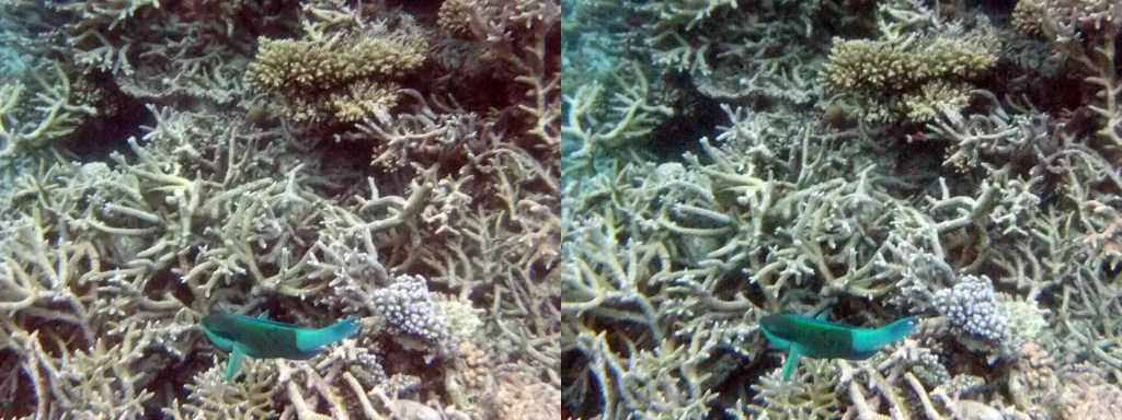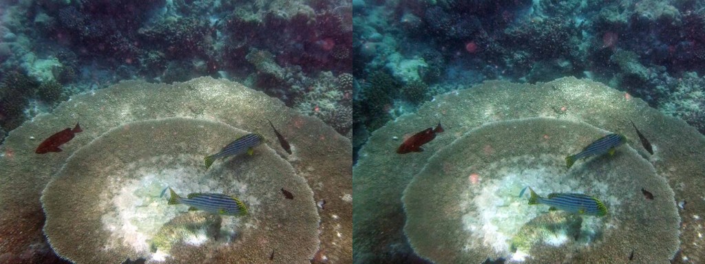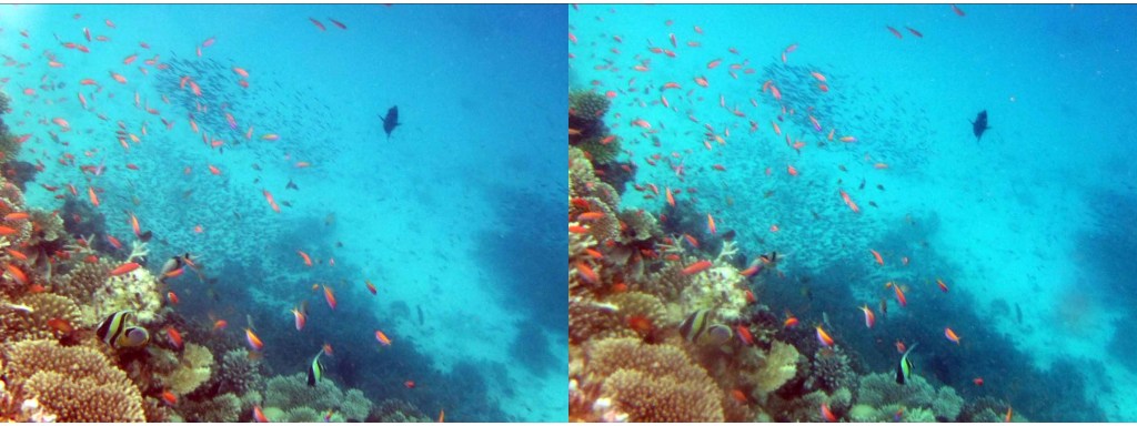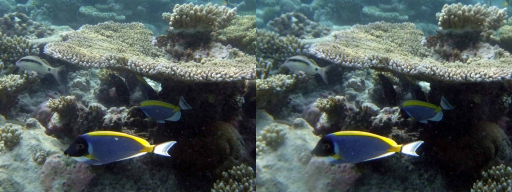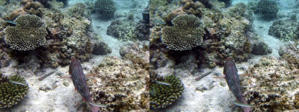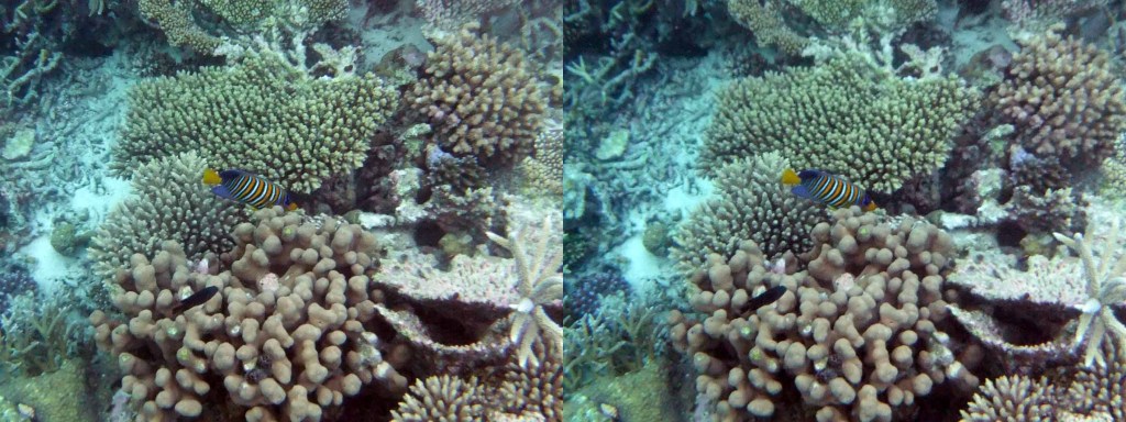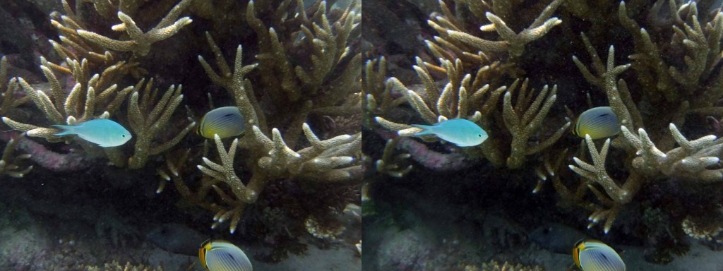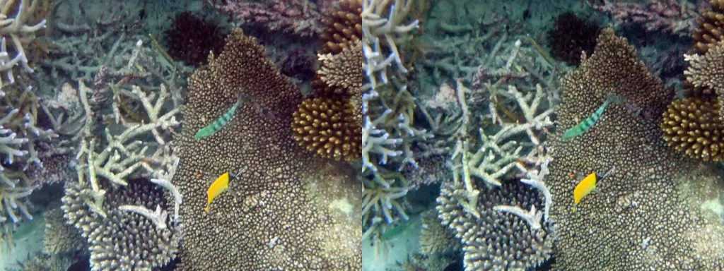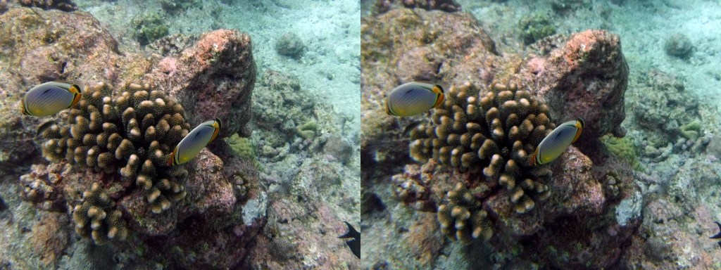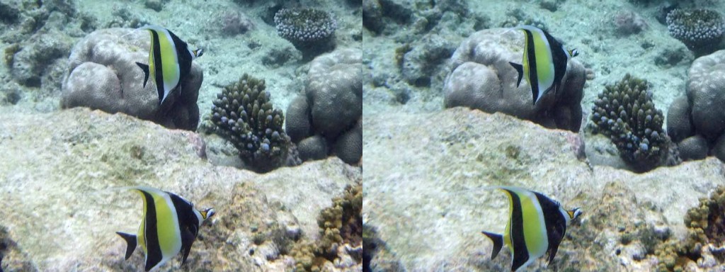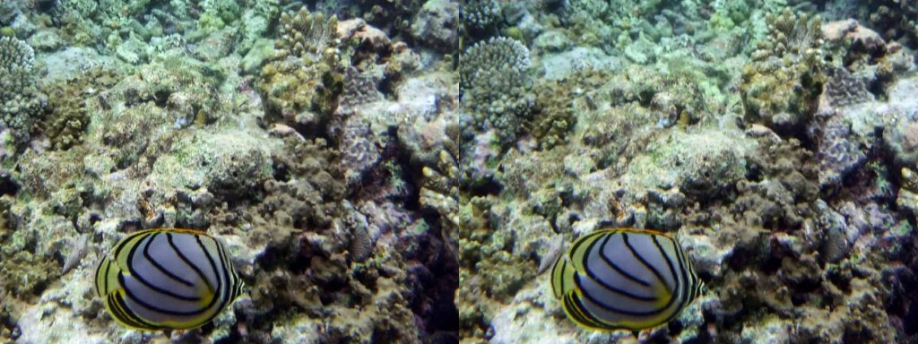 A Longnose Butterflyfish and a Six-barred Wrasse.