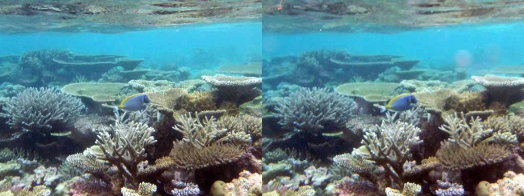 A Powder-blue Surgeonfish with Staghorn and table Corals.